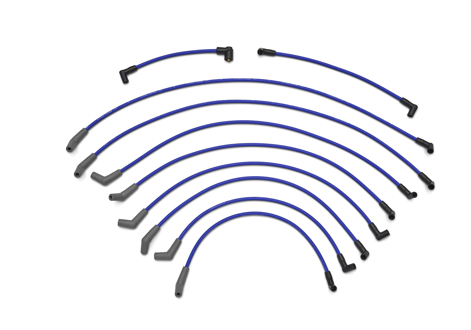 Wire-wound custom ignition wire sets feature low resistance for minimum spark loss. Silicone insulation and boots withstand high temperatures and voltage loss for minimum cross-fire and are highly resistant to fuels, oils and solvents. Long-life, tough stainless steel terminals for “post” type distributor caps. Includes coil wire for socket-type coil and “Ford Racing” identification. Cylinder number appears on each wire.